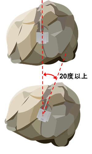 岩山などに設置した場合は、雨による侵食・気温等も関連した風化の影響により徐々に傾いていく状況を確認できます。